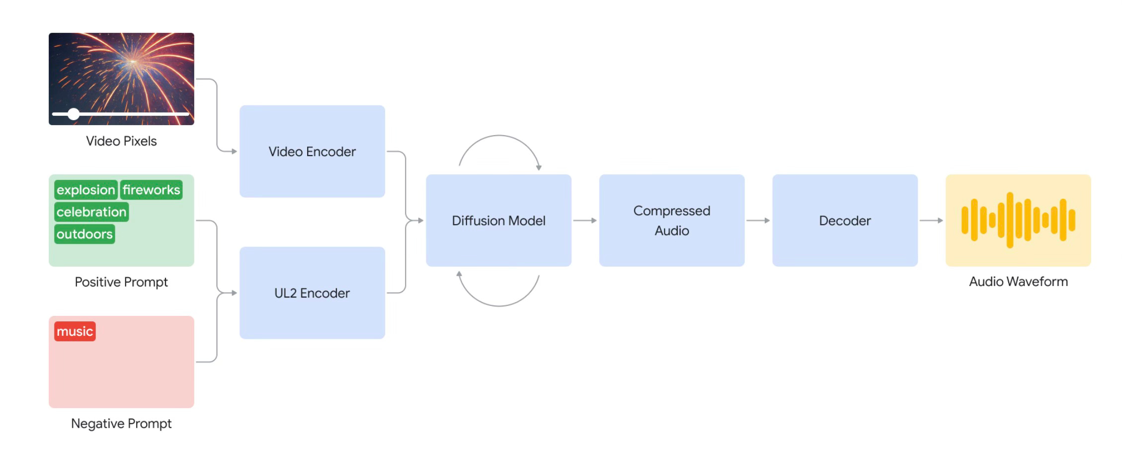 V2A can generate an unlimited number of soundtracks for any video input. Optionally, a ‘positive prompt’ can be defined to guide the generated output toward desired sounds, or a ‘negative prompt’ to guide it away from undesired sounds.