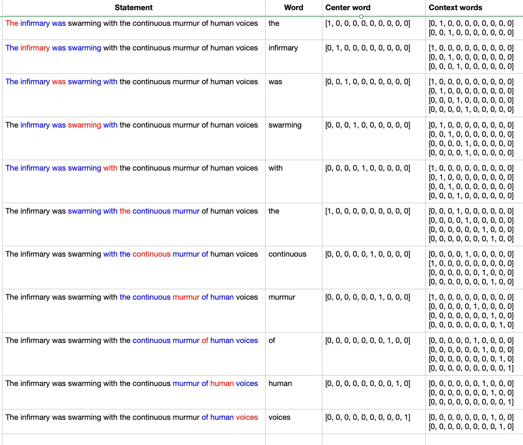 The infirmary was swarming with the continuous murmur of human voices.However, this is a pretty simple and useless embedding and there is no relation defined between the words here. To resolve this issue, the scoring system is revised, producing a vector for each word and adding information about words that appear together or close to each other in statements. This production of vectors for words can be done with single-layer neural networks with an input and an output layer, having a hidden layer in between.