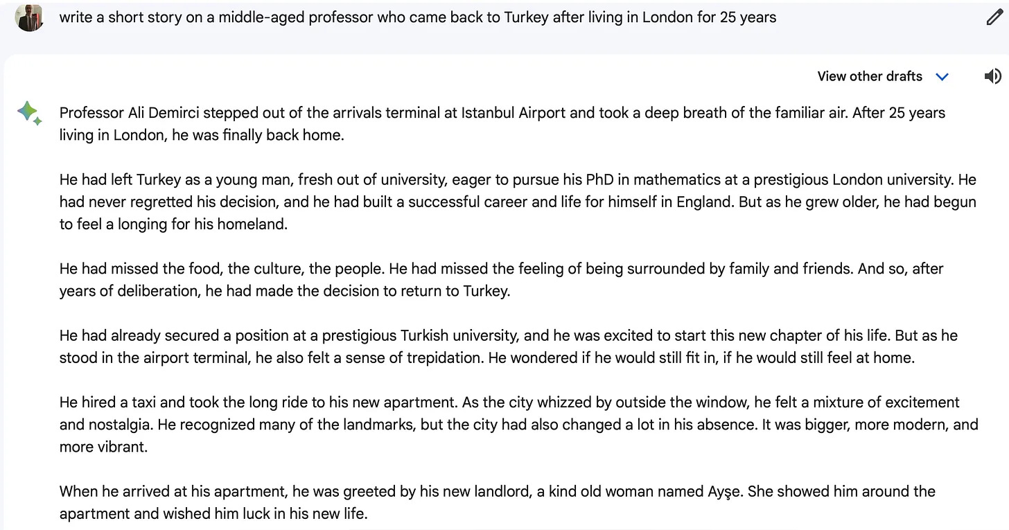 I tried the same prompt about an academician coming back to Turkey with Google Bard and tried to compare the results.