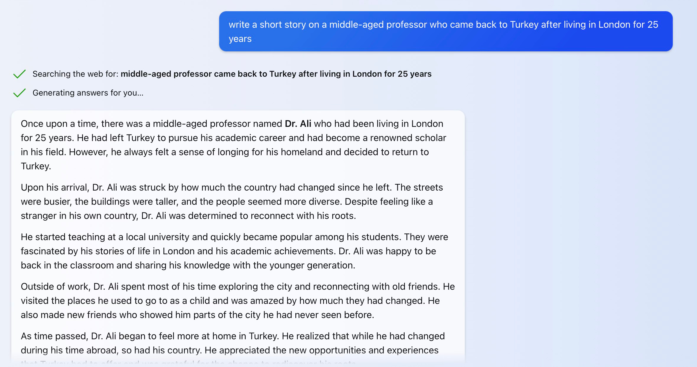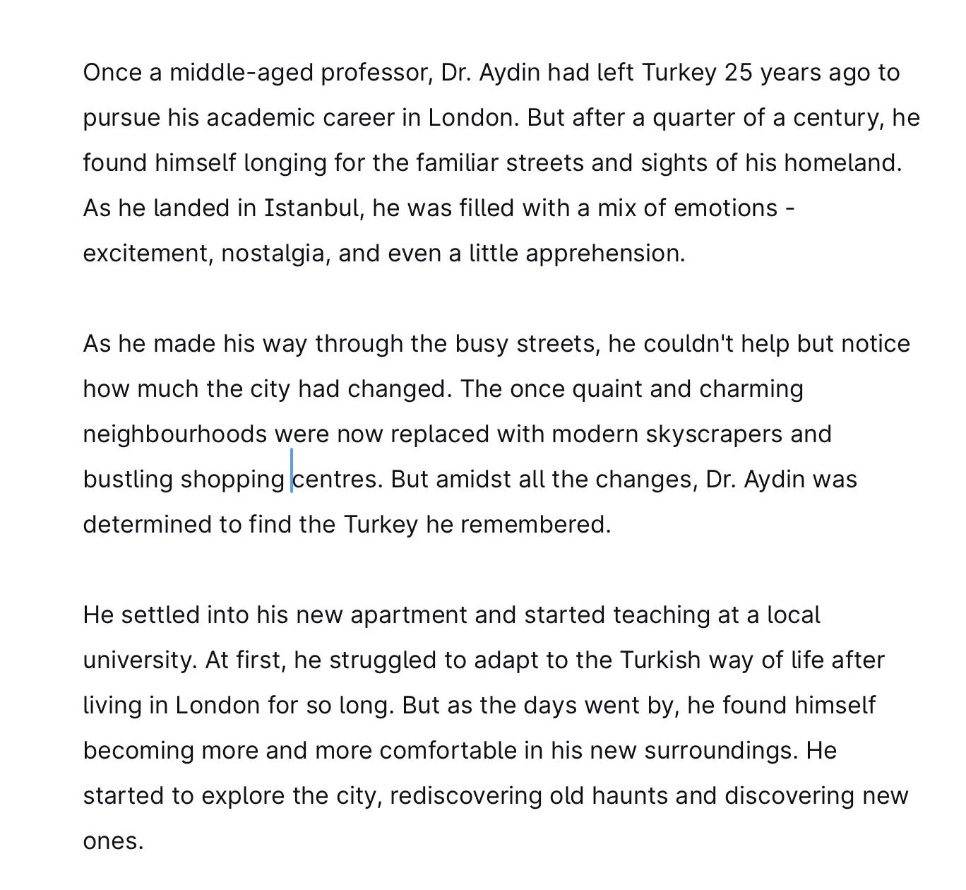 I’ve asked Bing to write for me the story of the academician coming back to Turkey from London after 25 years. Here is the result.