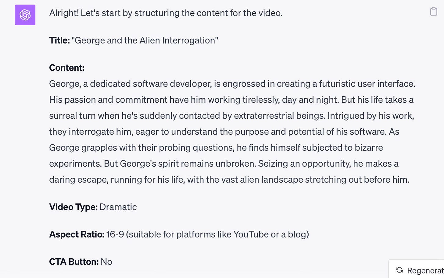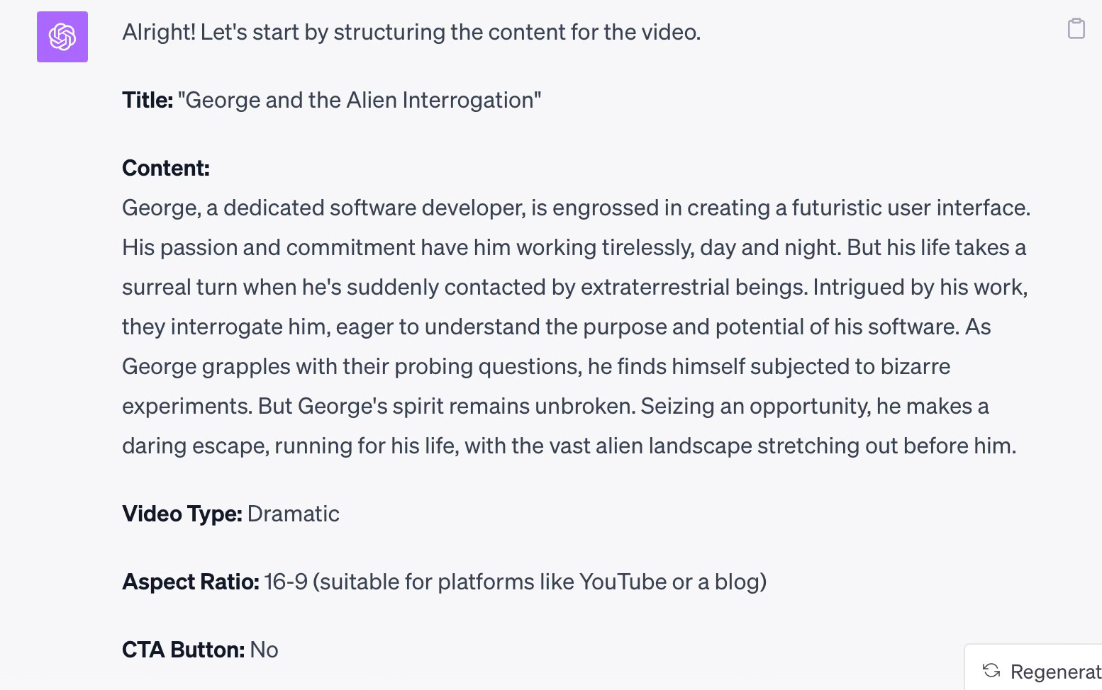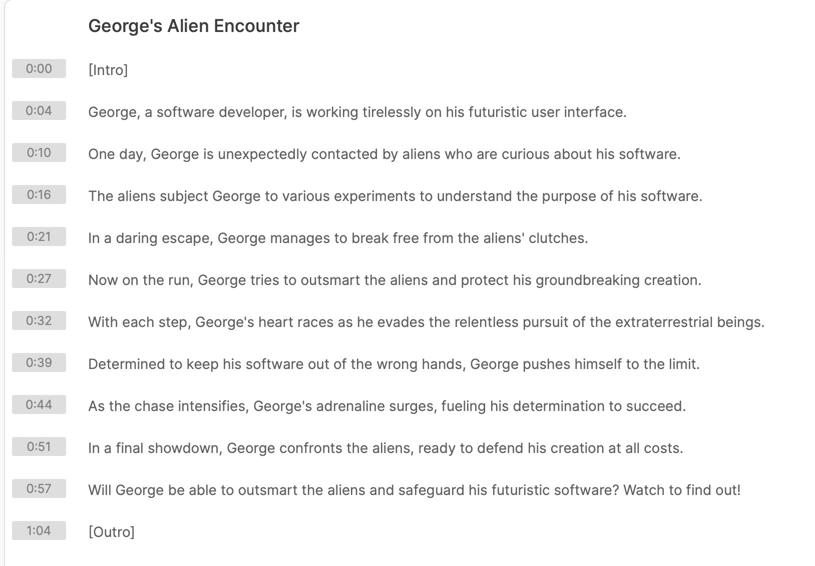 Develop a video with the following summary: George is a software developer who is working day and night, developing software for a futuristic user interface. He is contacted by aliens and interrogated to find out how the software is goiing to be used. They do experiments on him at one point, when he escapes and tries to get away on foot.The plugin expands the video description to make it a better fit for a short video. See the revised script below: